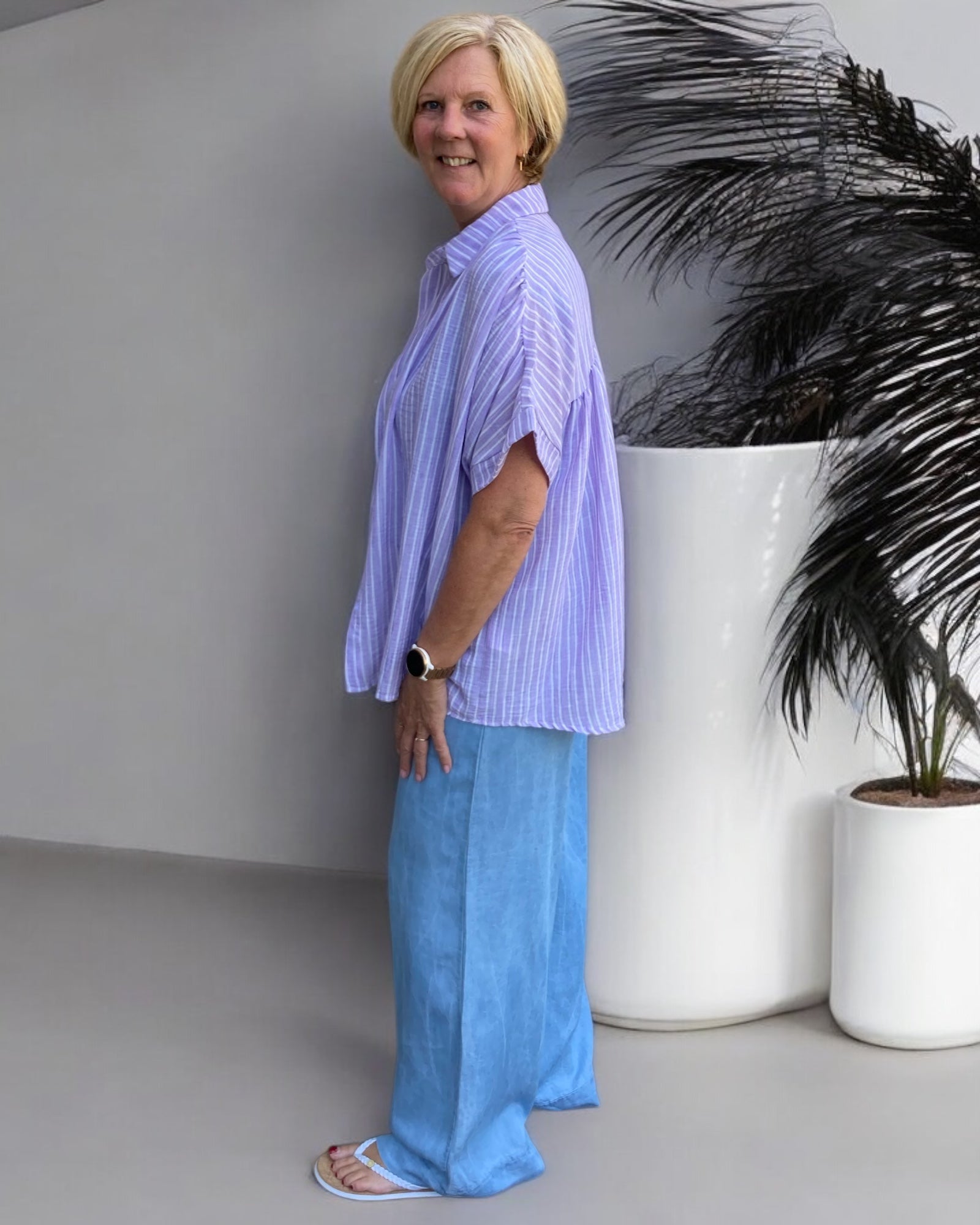 Dankzij de losvallende pasvorm en de korte mouw straalt deze zomerse blouse nonchalante klasse uit. Draag 'm los over een top, ingestopt in je broek of geknoopt op je rok. Een blouse waar je oneindig mee kunt combineren. Ook verkrijgbaar in beige, roze en lichtblauw.