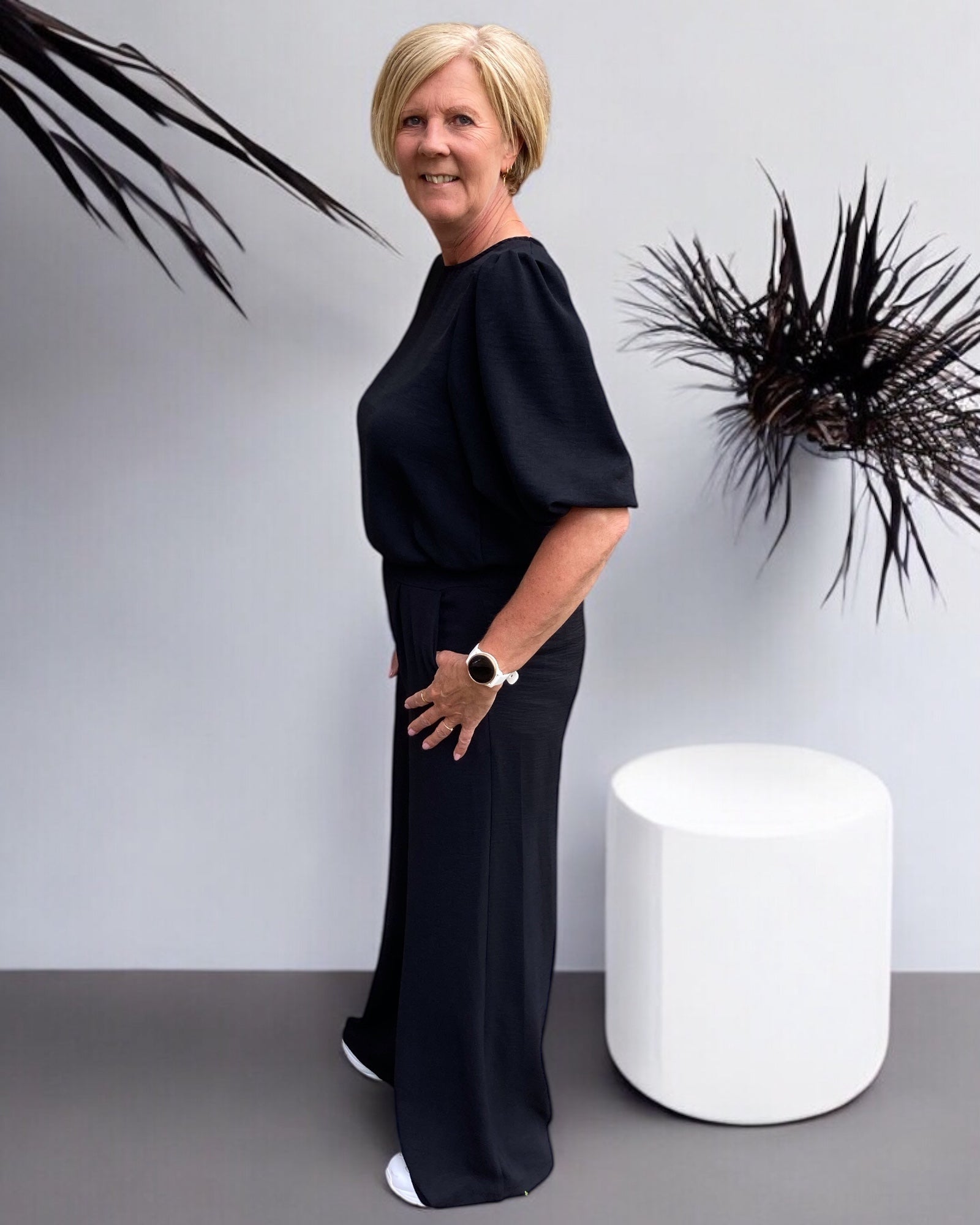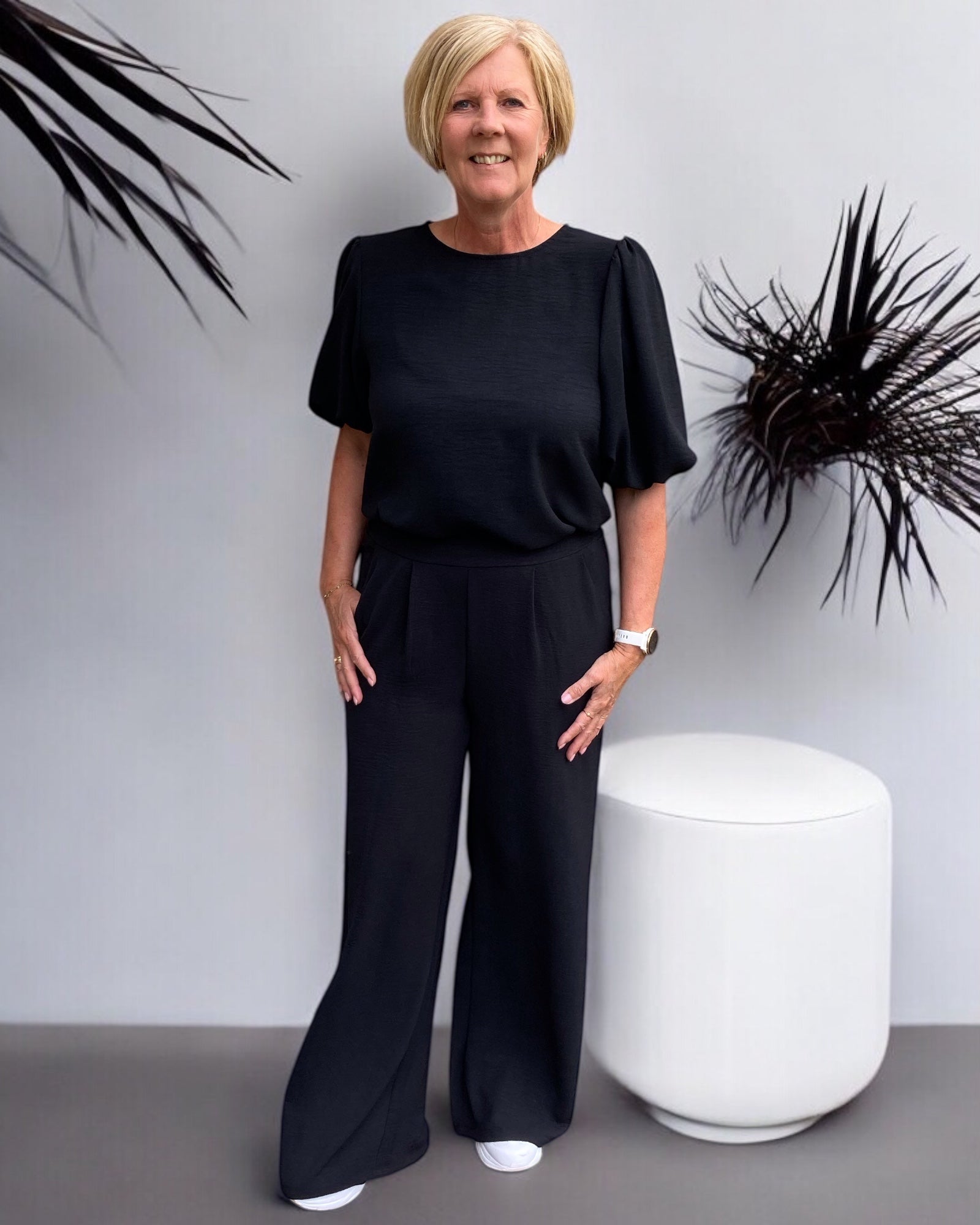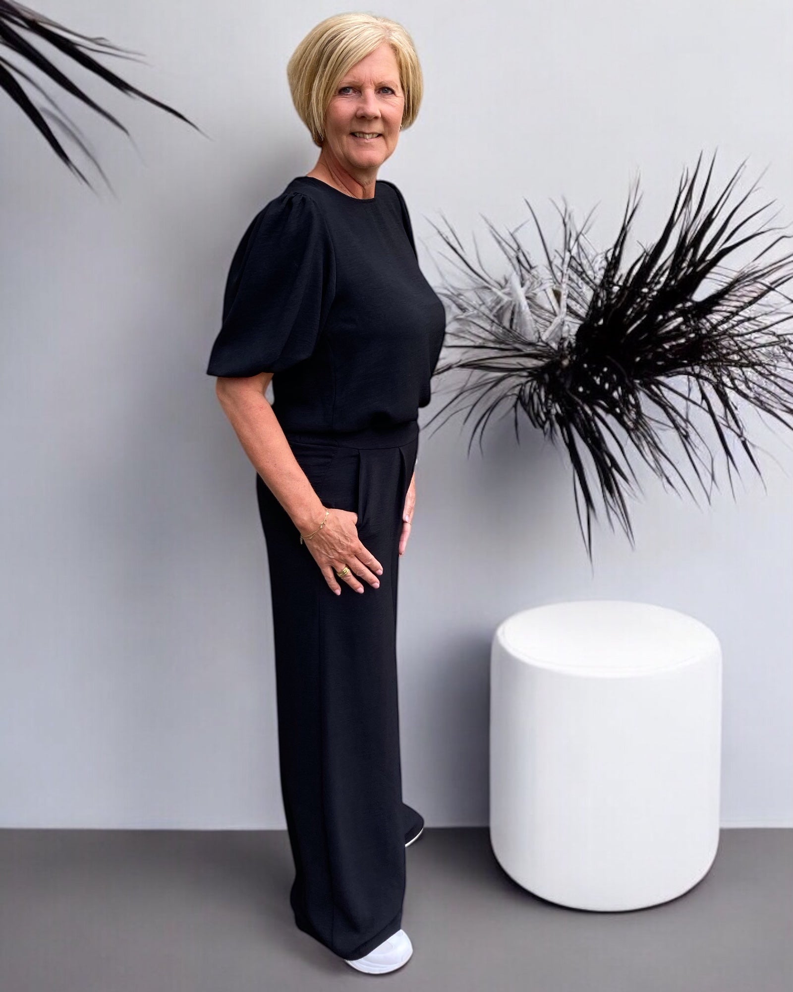 Altijd fijn om erbij te hebben zo'n top met pofmouw. En hoe fijn is het om deze te combineren met de bijpassende pantalon. Je bent meteen klaar en kunt lekker genieten van een heerlijke dag in een prachtig en comfortabel pak. Ook verkrijgbaar in beige, paars en kobalt.