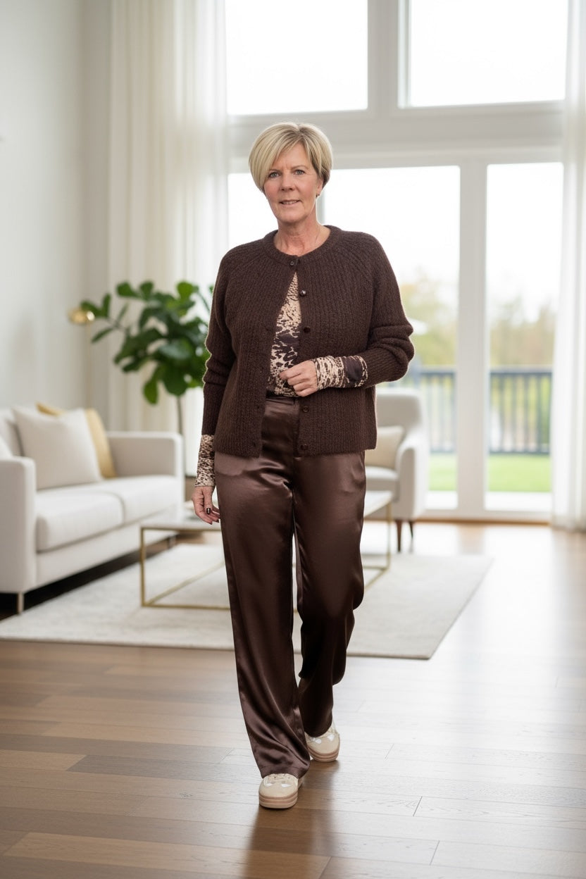 Een prachtige pantalon met een luxueuze maar soepelvallende stof. Op de foto gecombineerd met de mest top in bruin en het gebreide vest met glanzende knoopjes om tot een mooi geheel te komen. Een must-have voor je garderobe als je het mij vraagt!