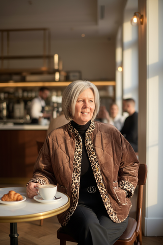 gewatteerde velvet jas met leopard boord in donkerbruin