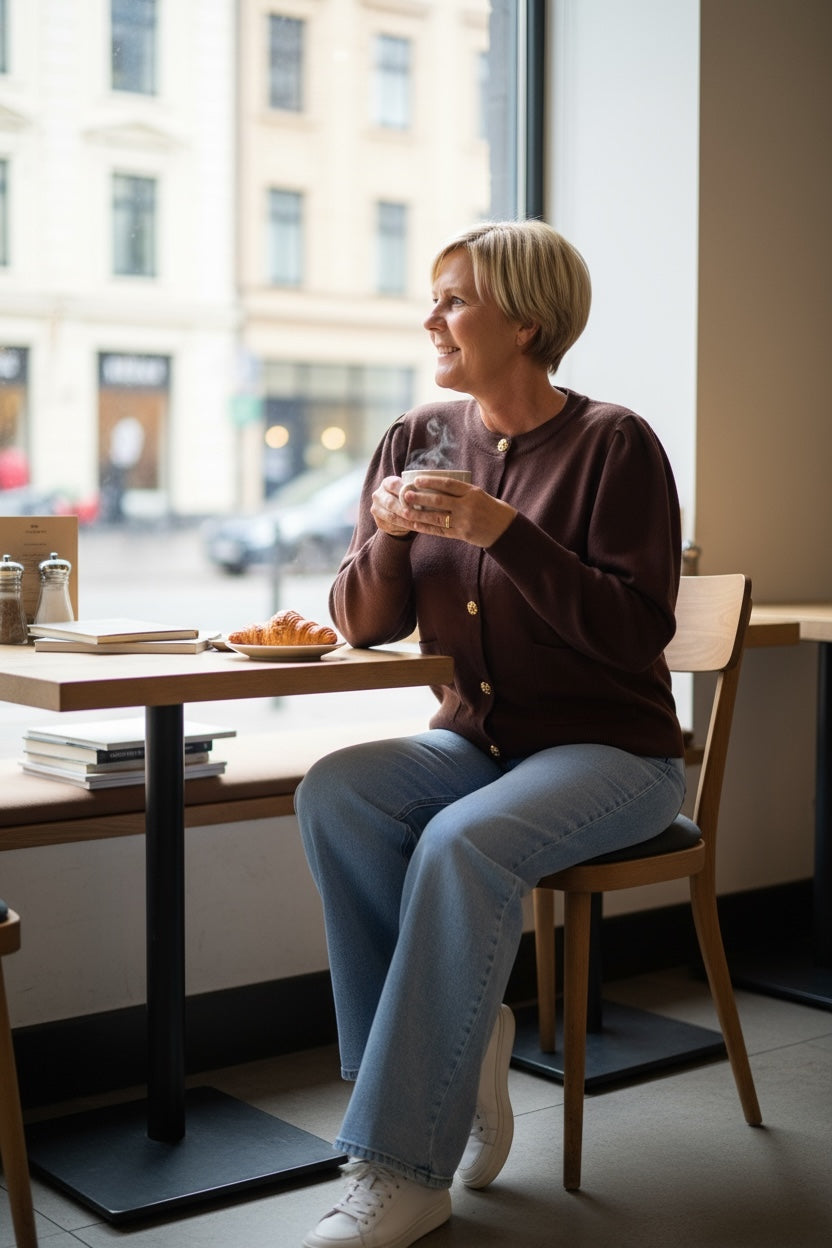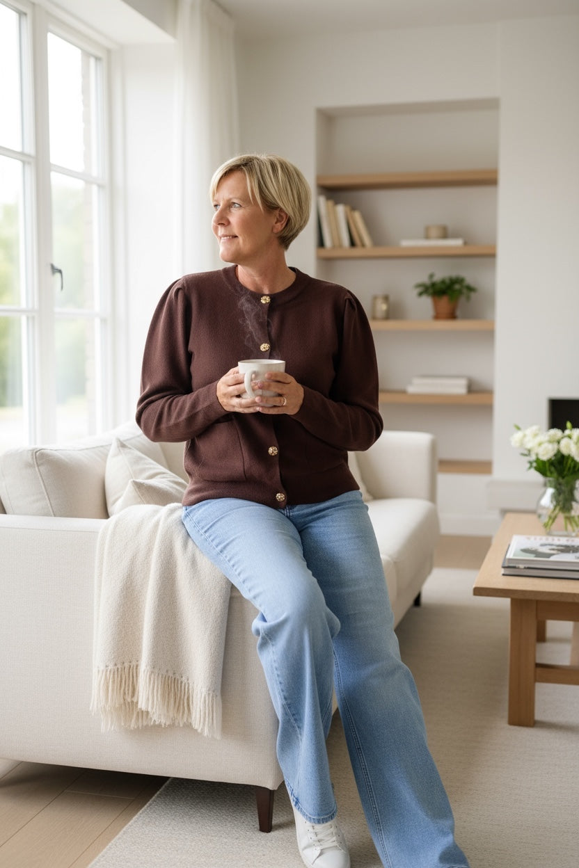 Gebreid vest met pofmouw en "bloem"knopen in bruin