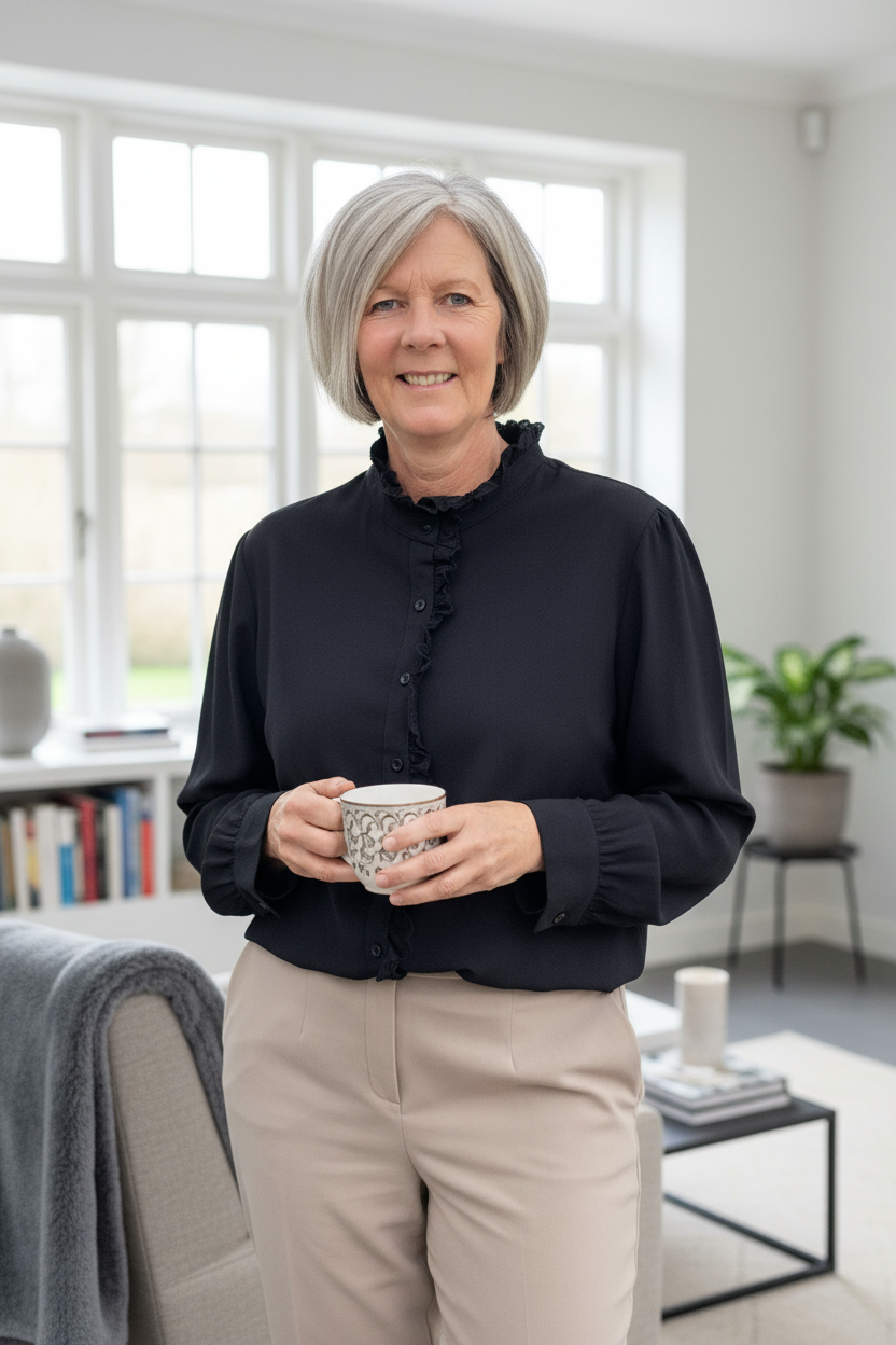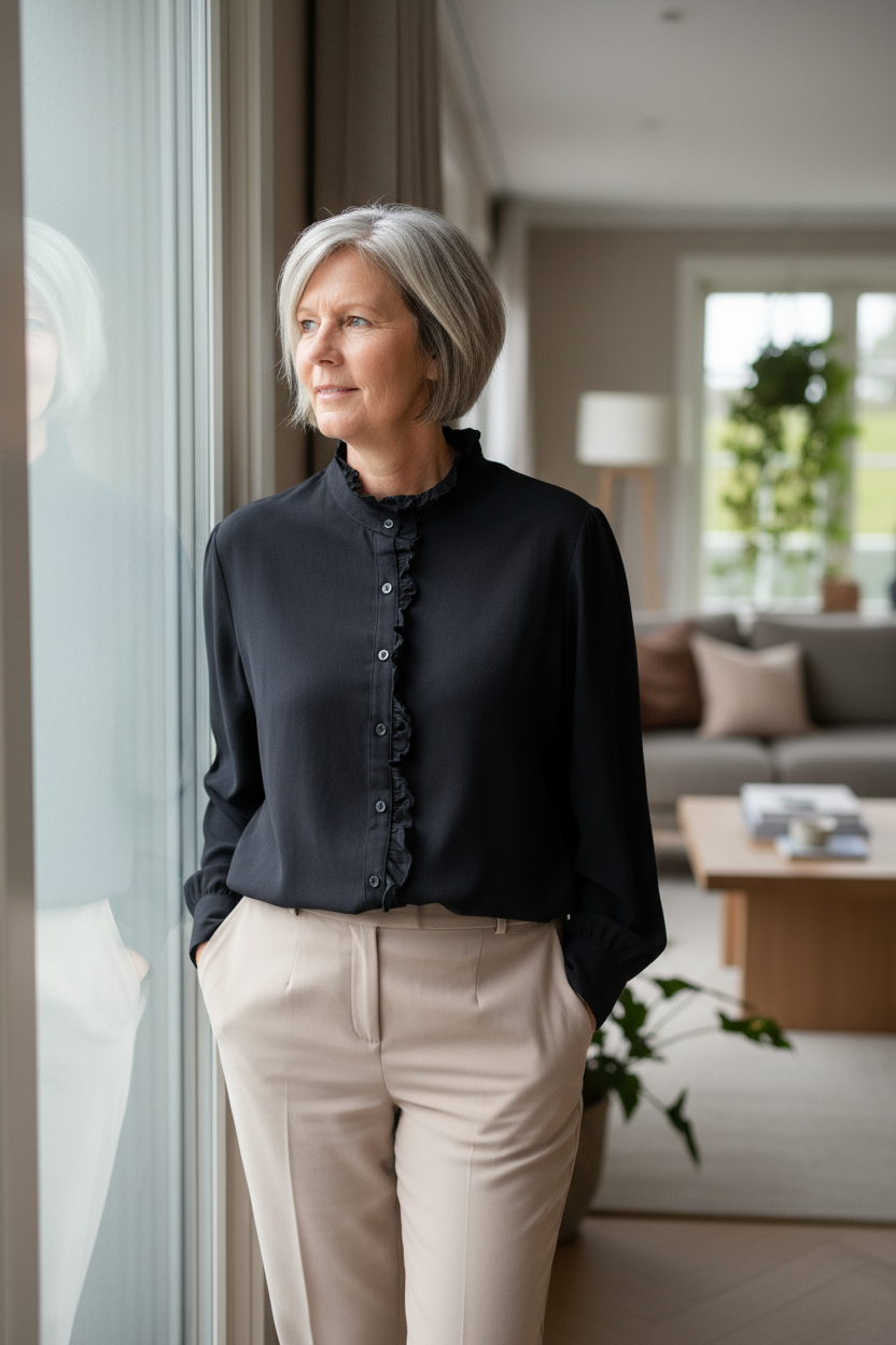 zwarte blouse met hoge kanten kraag